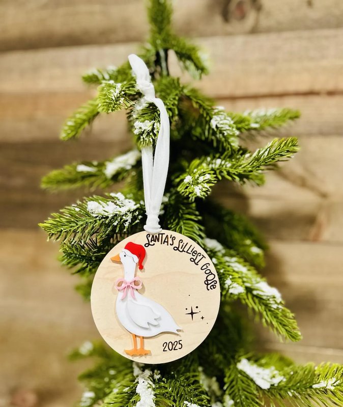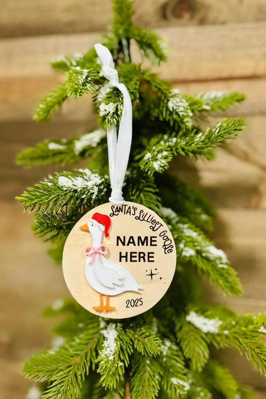 Add a touch of whimsy to your holiday décor with this adorable Santa’s Silliest Goose ornament! Featuring a sweet goose in a Santa hat and bow, this wooden ornament is perfect for celebrating the holiday season with laughter and charm. Personalize it with any name to make it extra special! The name (optional) will be engraved in the same font as the other text on the ornament in the location shown in the listing photo. Double-check spelling – your ornament will be made exactly as entered. Perfect for: ✔ Christmas tree decoration ✔ Holiday gift for family & friends ✔ Stocking stuffer ✔ Secret Santa or gag gift ✔ Goose lovers & farmhouse décor fans