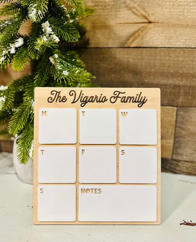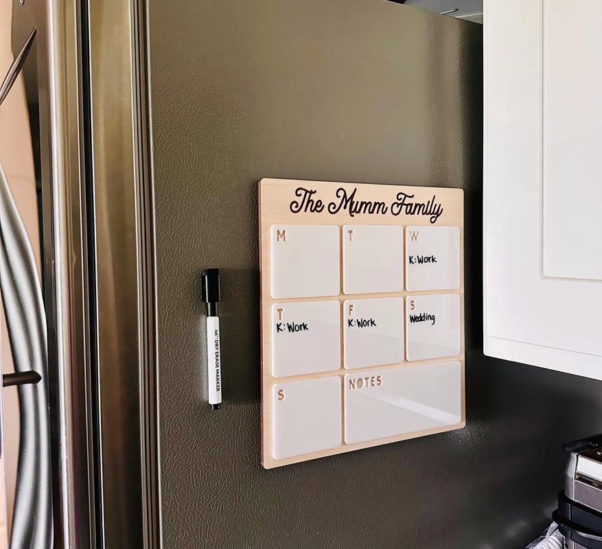 Keep your household organized in style with this personalized dry erase board weekly planner! Perfect for busy families, this modern and reusable planner helps everyone stay on top of work schedules, events, and special occasions. ✨ Features: • Custom engraved with your family name (e.g., “The Mumm Family”) • 7-day weekly layout with an extra Notes section • Dry erase surface for easy writing and cleaning • Elegant wood backing paired with glossy white acrylic tiles • Eco-friendly and reusable — no more paper waste! • Compact and decorative, fits beautifully on counters, desks, or shelves