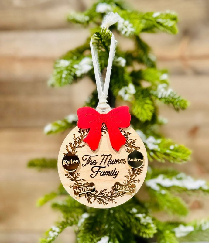 Celebrate your loved ones this holiday season with a beautifully crafted Personalized Family Christmas Ornament. This stunning wooden ornament features a festive wreath design, elegant engraved details, and a bright bow on top — the perfect blend of rustic charm and holiday spirit.