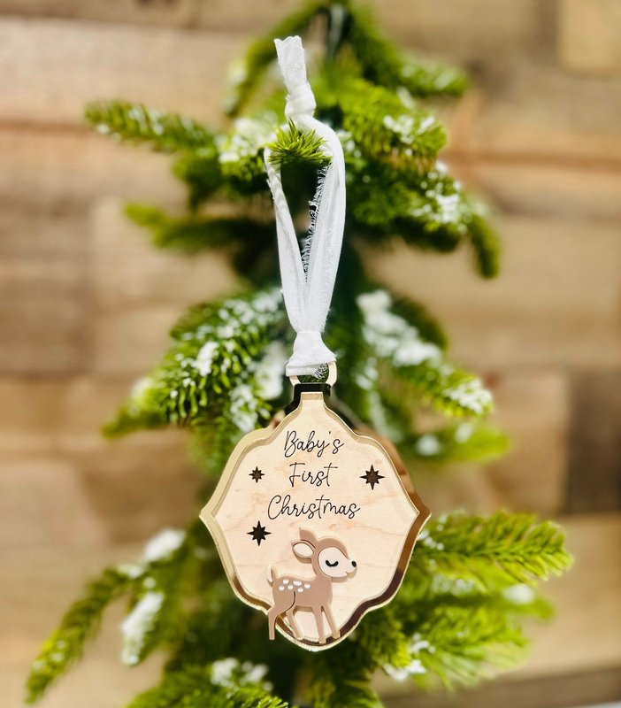Celebrate your little one’s very first Christmas with this beautifully crafted wooden ornament featuring an adorable baby deer and the phrase “Baby’s First Christmas.” A timeless keepsake to cherish for years to come.