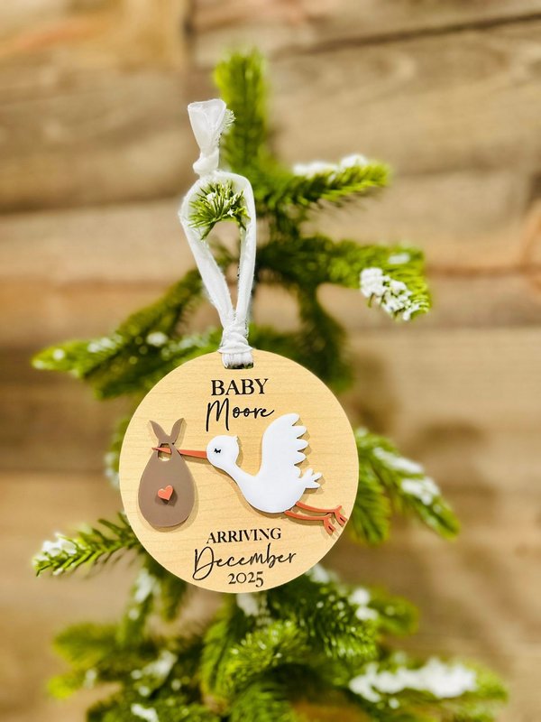 Celebrate your growing family with this beautiful handmade wooden ornament, featuring a sweet stork carrying a bundle — the perfect way to announce your baby’s upcoming arrival! Whether you’re sharing the news with loved ones or marking the year your little one is due, this keepsake is a treasured memory for years to come.