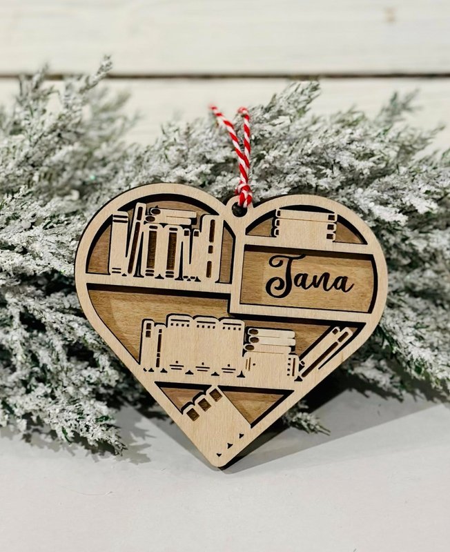 Celebrate a love of reading this holiday season with this beautifully handcrafted wooden heart ornament, designed especially for book lovers! Featuring a charming bookshelf design and personalized name engraving, this ornament makes a thoughtful keepsake for readers, teachers, librarians, and literary enthusiasts.