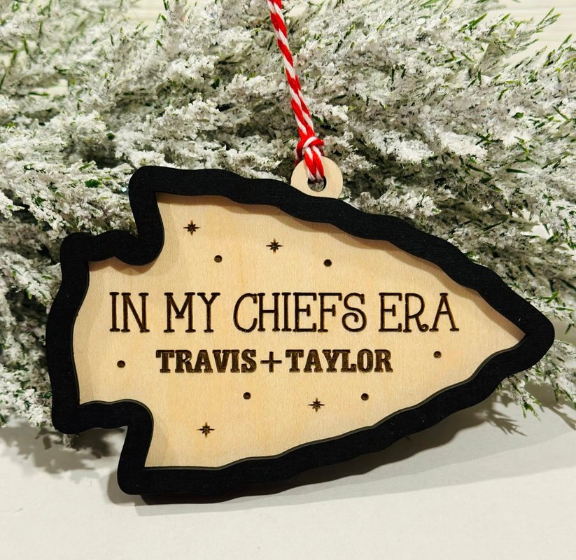 Celebrate the most talked-about duo and your favorite football team with this “In My Chiefs Era” wooden ornament! Perfect for Swifties, football fans, or anyone loving the mix of pop culture and game-day spirit, this ornament makes a fun and trendy addition to your Christmas tree.