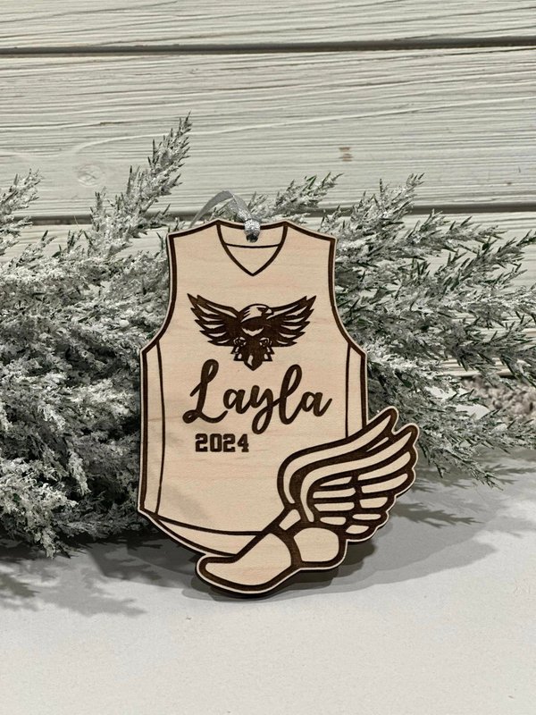 Celebrate your favorite runner with this Personalized Track & Field Ornament — a custom wooden keepsake perfect for athletes, coaches, and team gifts! Featuring a detailed track singlet design, engraved name, year, and winged shoe detail, this ornament beautifully honors the dedication and spirit of every runner. Whether for Christmas, the end of the season, or a team banquet, this piece makes a lasting memento of their accomplishments.