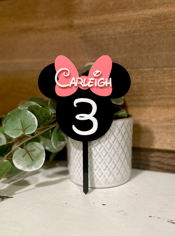 Celebrate your little one’s special day with this custom Minnie-inspired cake topper! 🎀 Each topper is handcrafted from layered acrylic and personalized with your child’s name and age, featuring an adorable pink bow accent — the perfect finishing touch for any Minnie-themed birthday party. Whether it’s for a 1st birthday, 3rd, or any age in between, this keepsake-quality topper adds a magical touch to your cake and can be saved as a cute memory from their big day!