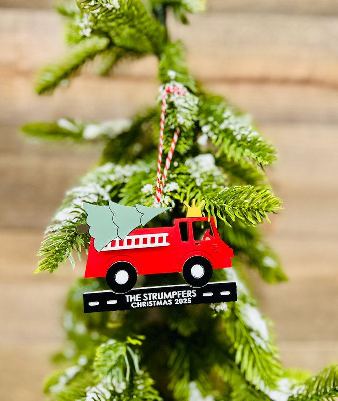 Bring some holiday cheer to your tree with this personalized firetruck family ornament! ππ Featuring a festive red firetruck carrying a Christmas tree, this custom ornament is engraved with your family name and year, making it the perfect keepsake for 2025. Handcrafted from layered acrylic, itβs a vibrant and durable decoration that will stand out beautifully on your Christmas tree. A wonderful gift for firefighter families, truck lovers, or anyone who loves unique, personalized ornaments.
