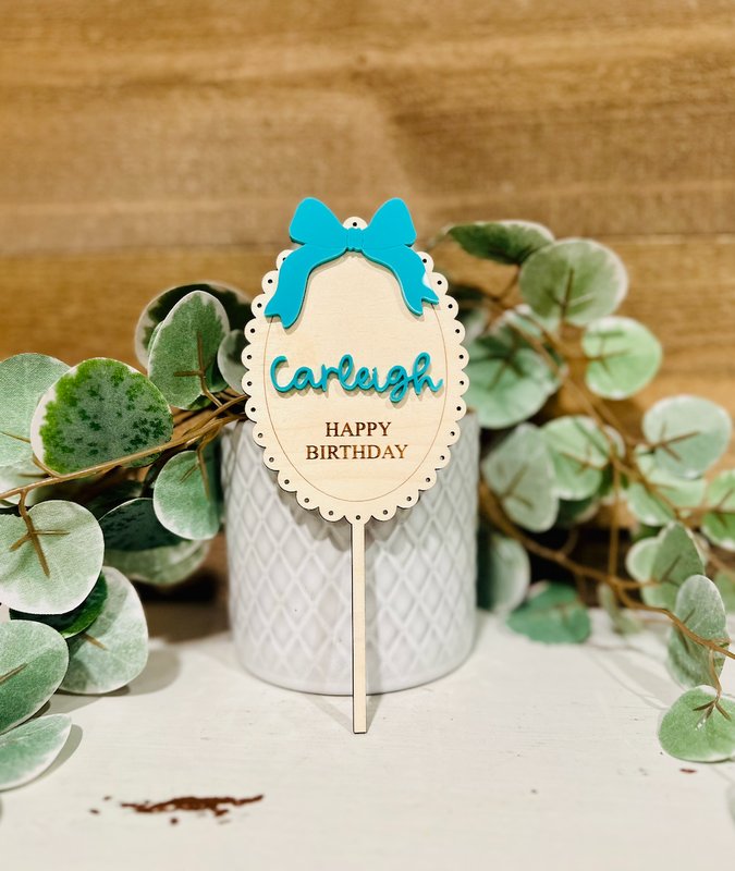 Add a sweet and personalized touch to your celebration with this custom bow cake topper! 🎀 Each topper features your child’s name in 3D acrylic lettering on a laser-cut wooden base, topped with a charming bow in your choice of color. Perfect for birthdays, cake smash photos, or any special occasion where you want to make their cake extra special! These toppers are lightweight, reusable, and made with love — the perfect blend of cute and classic for your party theme.