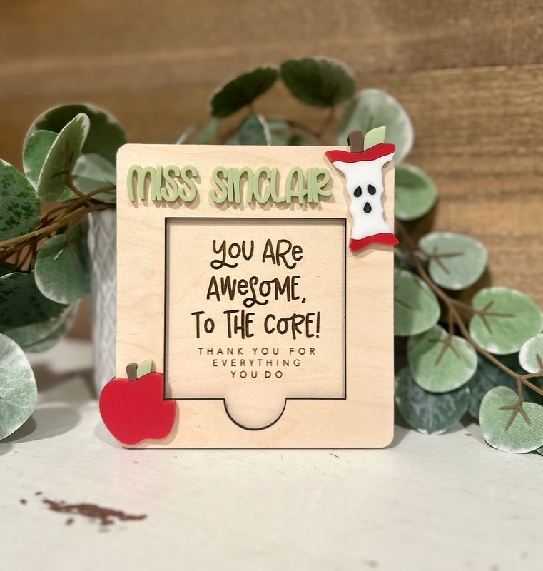 Show your favorite teacher how truly awesome to the core they are with this personalized Post-it note holder! 🍎 Handcrafted from premium wood, each holder features laser engraving and colorful layered acrylic accents — including a cute apple and apple core design. The teacher’s name is highlighted in raised 3D acrylic letters, adding a unique, custom touch. Post-it notes sold separately. This note holder perfectly fits a standard sticky note pad and makes a practical yet heartfelt gift for any educator. It’s perfect for Teacher Appreciation Week, the start of a new school year, or as a holiday gift!