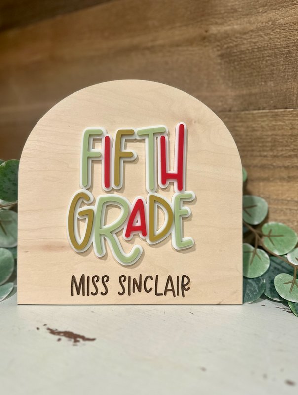 Brighten up your classroom with this personalized teacher sign, the perfect mix of modern design and playful color! 🌈 Each sign features a layered acrylic “FIFTH GRADE” design in cheerful pastel and red tones, paired with the teacher’s name engraved on smooth birch wood. The arched shape adds a trendy touch that fits perfectly on desks, shelves, or classroom walls. Handmade with care, this sign makes a wonderful teacher appreciation gift, classroom decoration, or back-to-school surprise. Customize it for any grade or teacher name to make it uniquely theirs! 🍎