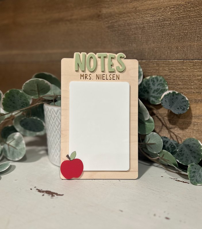 Keep your desk stylish and organized with this adorable personalized dry erase board! Perfect for teachers, this handcrafted wooden board features a clean, modern design with a layered “NOTES” header, customizable name engraving, and a charming red apple accent. It’s ideal for jotting quick reminders, to-do lists, or classroom notes — and wipes clean for endless reuse!