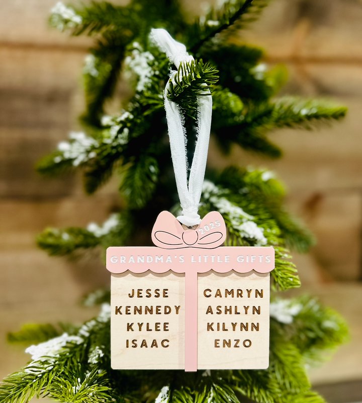 Celebrate love with this heartfelt personalized Christmas ornament — a perfect keepsake to treasure year after year! Shaped like a gift box and engraved with the names of little blessings, this ornament beautifully captures the spirit of family and giving. Each ornament is handcrafted with a combination of natural wood and acrylic for a warm, timeless look.