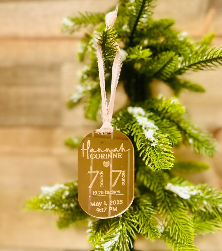 Celebrate your little one’s arrival with this elegant personalized baby birth stats ornament! Beautifully crafted from mirror acrylic and engraved with your baby’s name, birth date, time, weight, and length, this ornament makes a timeless keepsake for new parents, grandparents, or baby’s first Christmas. Each piece is finished with a soft ribbon, perfect for hanging on a Christmas tree or displaying year-round in the nursery.