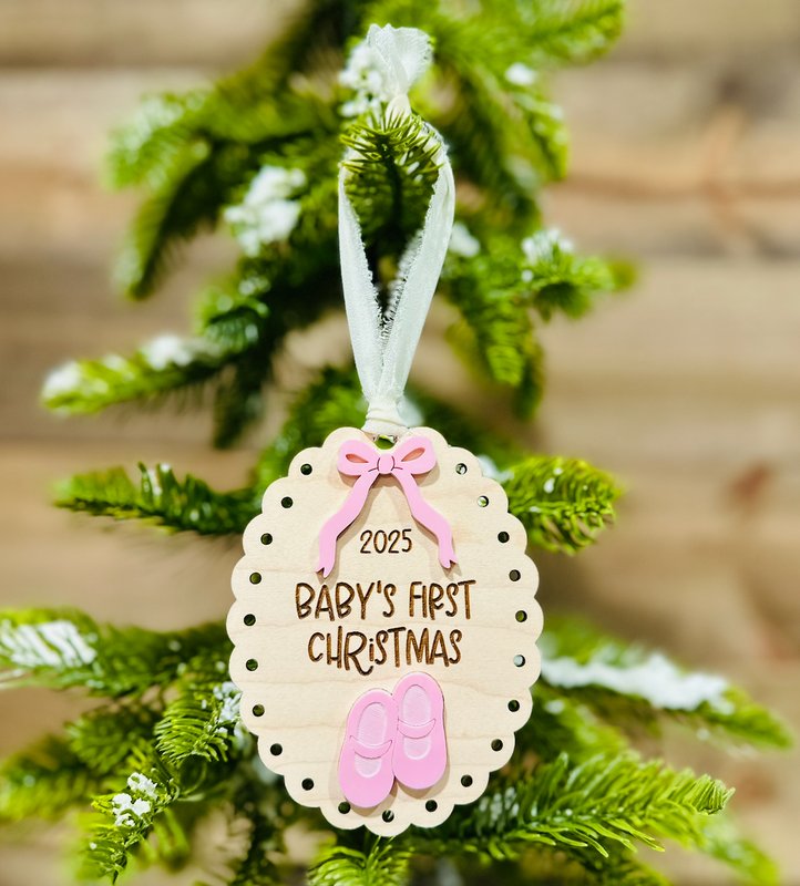 Celebrate your little one’s very first Christmas with this sweet handmade wooden ornament! Featuring engraved text, a bow, and matching baby booties, this ornament captures the magic of your baby's first holiday season.