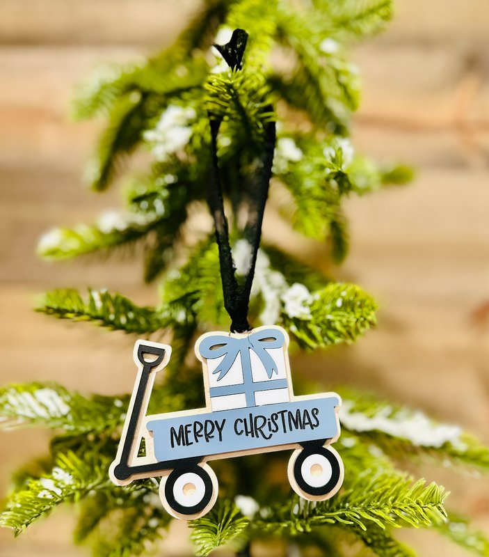 Add a touch of nostalgic charm to your Christmas tree with this adorable “Merry Christmas” wagon ornament! Featuring a festive blue wagon carrying a wrapped present, this piece captures the joy and warmth of the holiday season in a playful, handcrafted design.