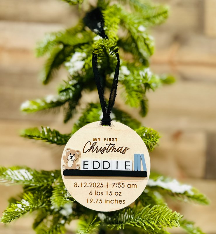 Celebrate your baby’s very first Christmas with this beautifully personalized ornament! Featuring engraved birth details and a sweet teddy bear accent, this handcrafted keepsake is the perfect way to remember your little one’s first holiday season. Each ornament includes your baby’s name, birth date, time, weight, and length — all carefully engraved on natural wood and layered with acrylic accents for a modern, timeless look. It makes a meaningful addition to your own tree or a thoughtful gift for new parents, grandparents, or godparents.