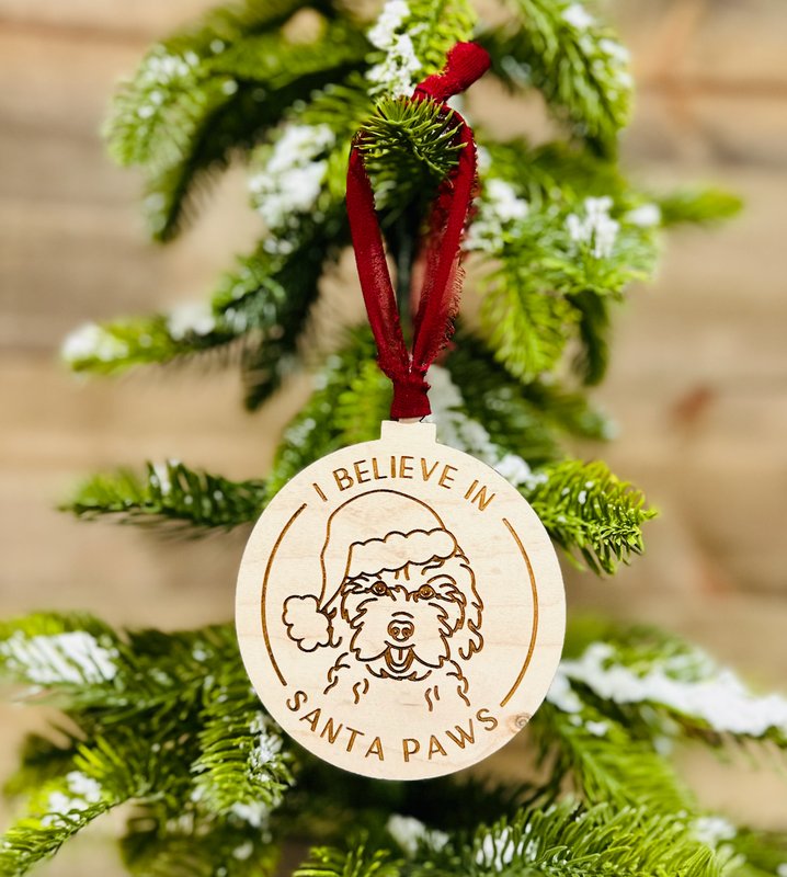 Celebrate the holidays with your furry best friend! This ornament is the perfect addition to your Christmas tree and a must-have for every pet lover. Made from high-quality wood and engraved with an adorable pup wearing a Santa hat, it’s a festive way to show that even your four-legged family members believe in the magic of Christmas.
