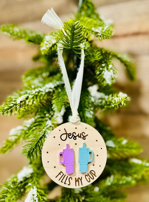 Celebrate the true meaning of Christmas with this faith-inspired “Jesus Fills My Cup” ornament — a perfect reminder of gratitude, joy, and the love that fills us daily. Handmade from natural wood and accented with vibrant acrylic tumblers, this unique ornament blends faith and fun for a meaningful touch to your holiday décor.