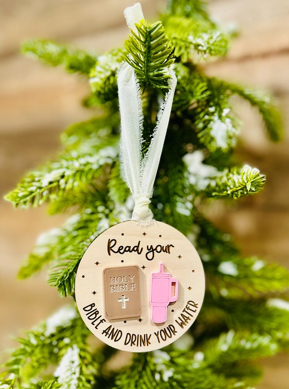 Keep your faith front and center this holiday season with this inspirational “Read Your Bible and Drink Your Water” ornament. Handmade from beautiful natural wood and accented with bright acrylic pieces, this ornament is the perfect daily reminder of balance, faith, and self-care — with a fun twist!