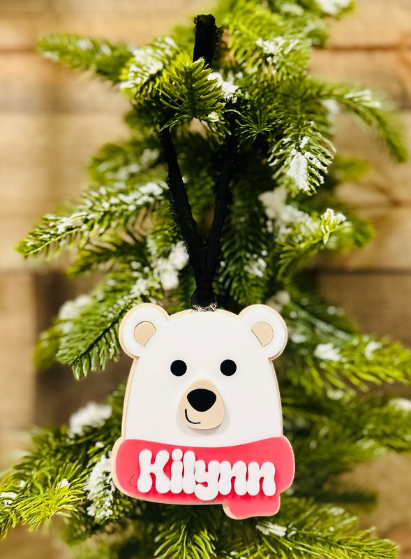 Add a cozy touch of Arctic charm to your Christmas tree with this adorable personalized polar bear ornament! Featuring a smiling polar bear face and a festive scarf with your custom name in raised 3D acrylic lettering, this ornament makes a perfect keepsake for kids, families, or animal lovers.