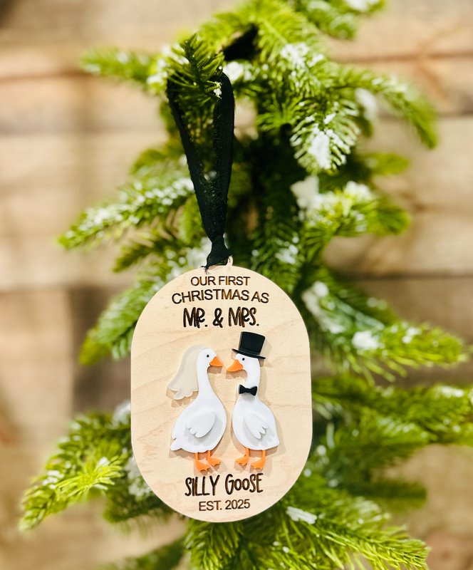 Celebrate your first Christmas as a married couple with this adorable “Silly Goose” ornament! Featuring two charming geese dressed as bride and groom, this handcrafted ornament is the perfect blend of humor, love, and sentimentality. It’s a sweet keepsake for newlyweds — or a fun wedding gift for your favorite “silly geese.”