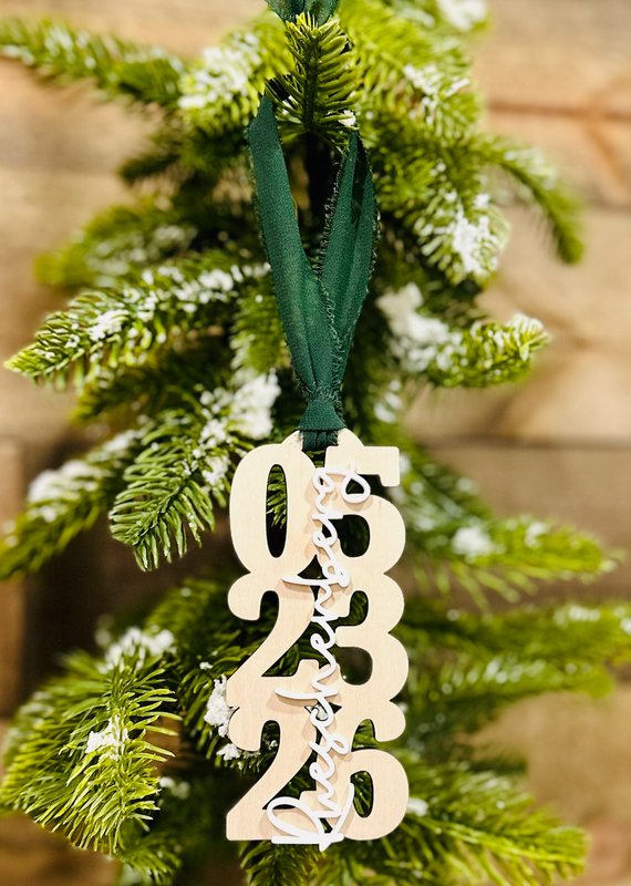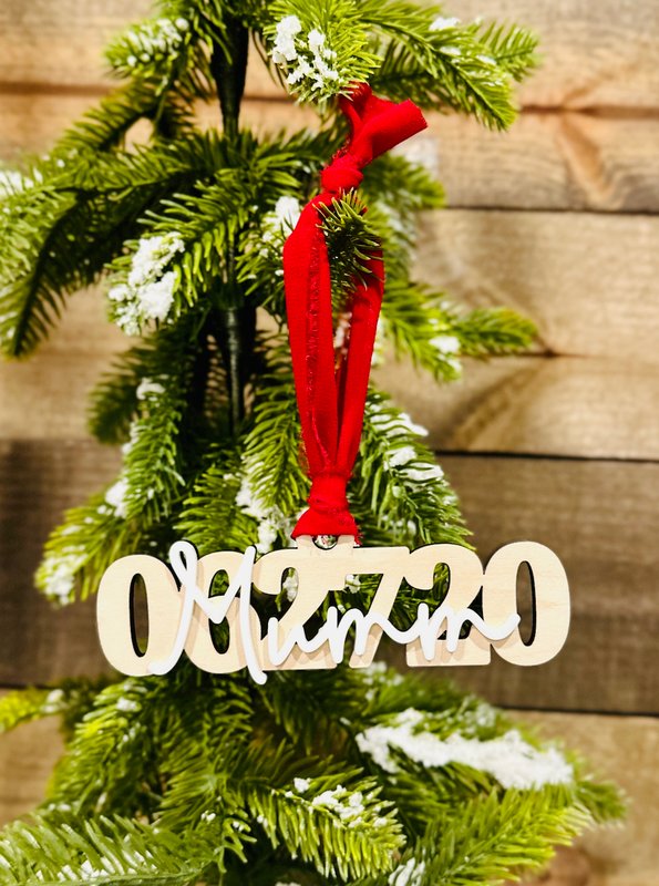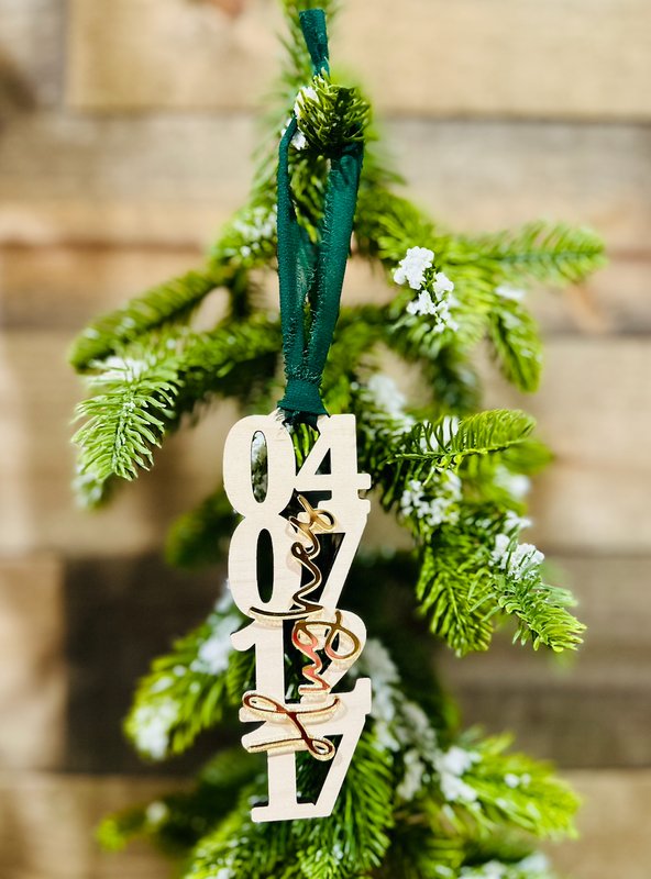 Commemorate a special year with this modern wooden date ornament, beautifully handcrafted for your Christmas tree. Designed with a bold stacked number layout and elegant script name overlay, this ornament adds a personalized and contemporary touch to your holiday décor.
