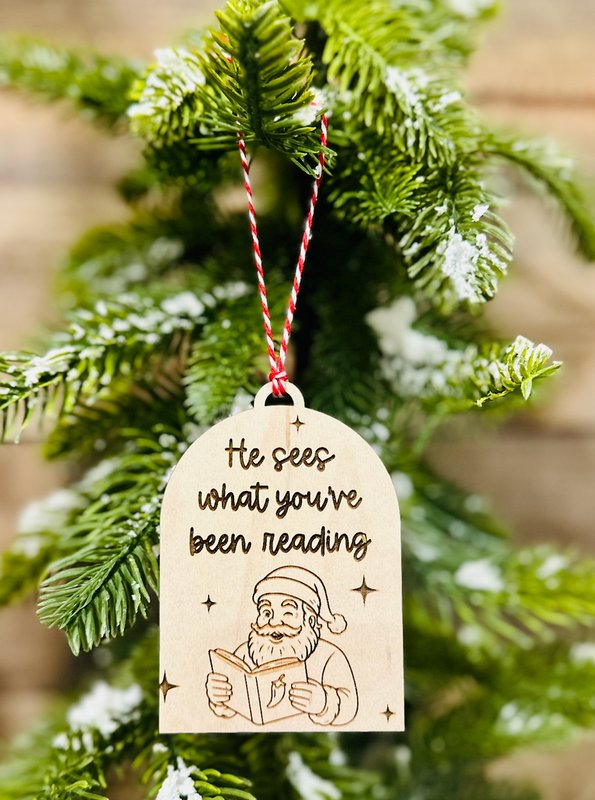 Bring a playful twist to your holiday décor with this laser-engraved wooden ornament featuring a jolly Santa holding a book and the phrase, “He sees what you’ve been reading.” Perfect for bookworms, librarians, teachers, or anyone who loves to read, this ornament combines humor, charm, and cozy Christmas vibes.