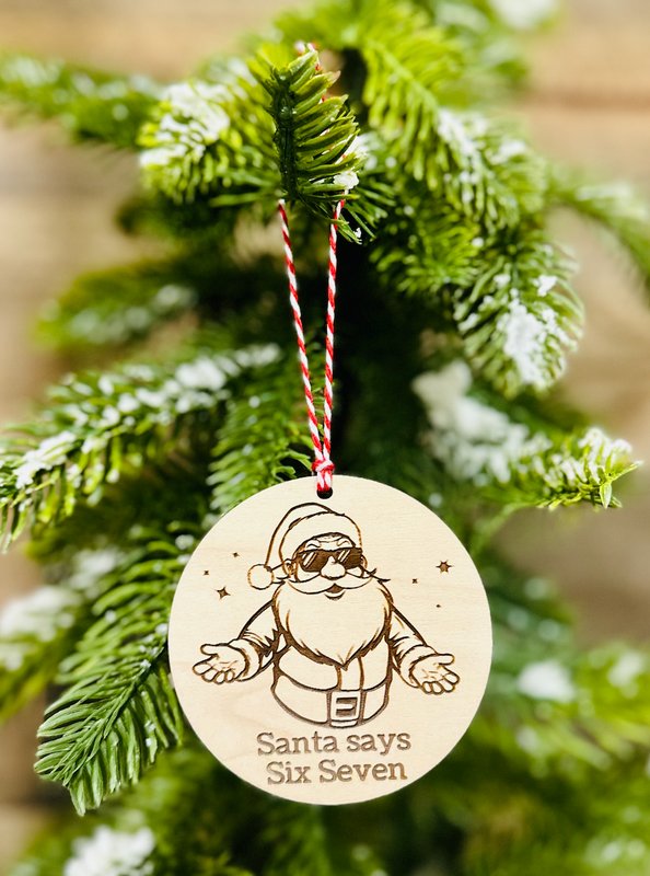 Bring some humor and cool vibes to your holiday décor with this “Santa Says Six Seven” wooden ornament! Featuring a laser-engraved Santa sporting shades and a confident shrug, this ornament is perfect for those who love a little inside joke or lighthearted Christmas fun.