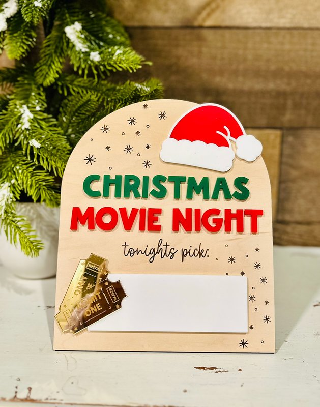 Make your holiday season extra cozy with this Christmas Movie Night sign — the perfect way to turn an ordinary evening into a festive family tradition! This adorable sign features bold 3D lettering, a cheerful Santa hat accent, and a dry-erase area where you can write your movie of the night. Whether it’s Elf, The Polar Express, or Home Alone, this sign adds a touch of magic to every movie night! Handcrafted from premium wood with layered acrylic details, it’s a fun and reusable piece that will bring joy year after year.