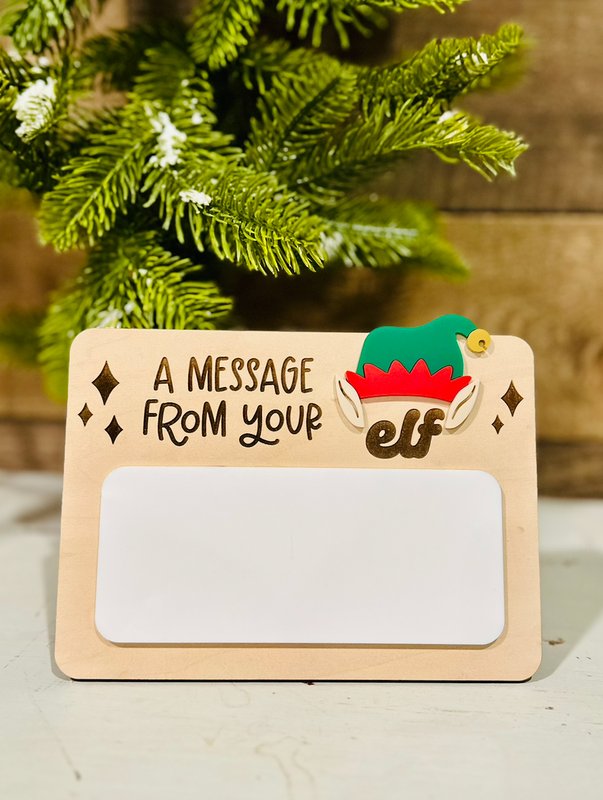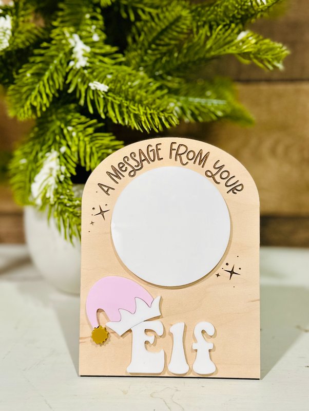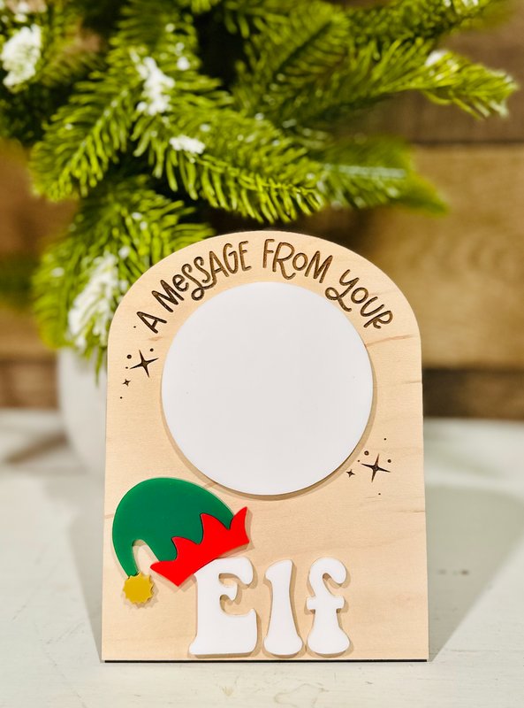 Make your family’s Christmas mornings even more magical with this “A Message from Your Elf” sign! This adorable dry erase board gives your family elf a fun and creative way to communicate with the kids — whether it’s a silly note, a reminder to be kind, or a special holiday message. Each sign is handcrafted from premium wood with layered acrylic details, featuring a festive elf hat and whimsical lettering. The dry erase area lets you write, erase, and reuse it all season long — no more paper notes or mess!
