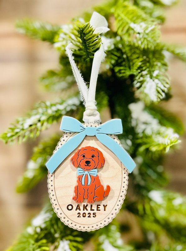 Celebrate your furry friend with this personalized dog Christmas ornament, custom-made to capture the love you have for your pup. đ¶âš Perfect for Christmas trees, gift exchanges, new puppy celebrations, or memorial keepsakes.This ornament features an adorable puppy illustration with a charming bow, engraved with your petâs name and year, making it a timeless holiday keepsake youâll treasure for years to come.