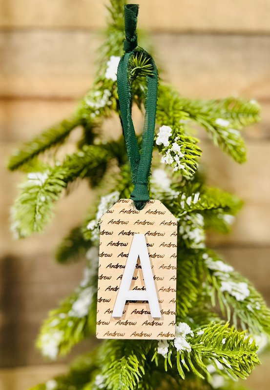 Add a meaningful and timeless touch to your Christmas stocking with this personalized initial tag, custom-designed with a repeating name background and a bold layered initial. 🎄✨