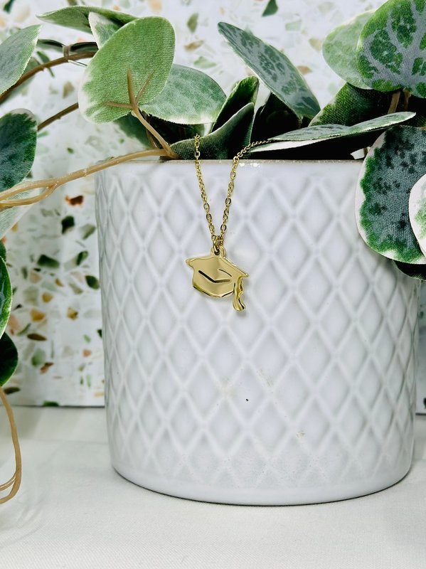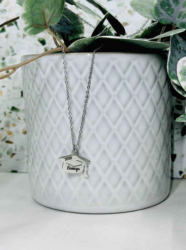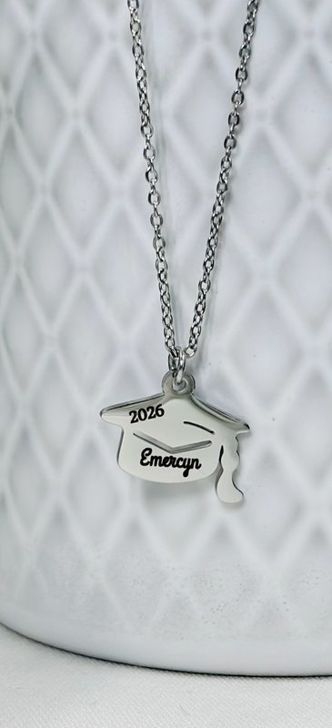 Celebrate a milestone moment with this personalized graduation cap necklace, a meaningful keepsake designed to honor hard work, dreams, and new beginnings 🎓✨ This delicate necklace features a graduation cap charm engraved with a custom name and graduation year, making it a timeless gift your graduate can treasure long after the ceremony. Please email or message me on Facebook to discuss all necklace + charm customization options.