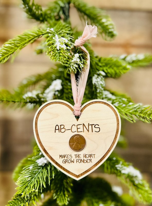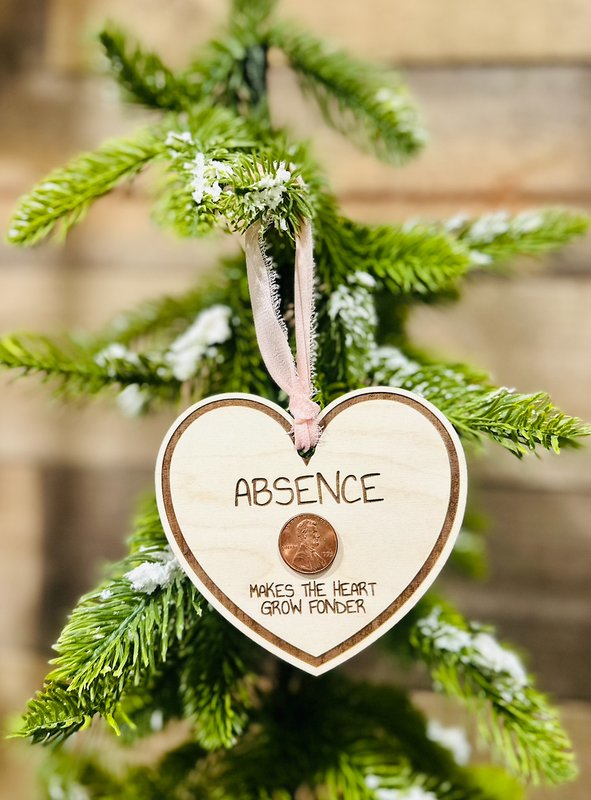 Sometimes the smallest things carry the biggest meaning. 💛 These handcrafted penny ornaments feature a heartfelt (and clever) twist on the classic phrase “Absence makes the heart grow fonder.” Choose between two wordplay styles: “Absence” and “Ab-Cents” (because a penny really is missing!) Each ornament is made from smooth, natural wood, engraved with care. Hung with a soft ribbon, they make a thoughtful keepsake for loved ones near or far.