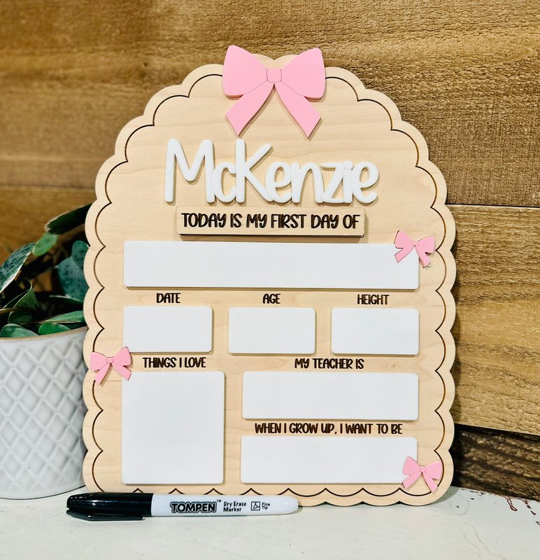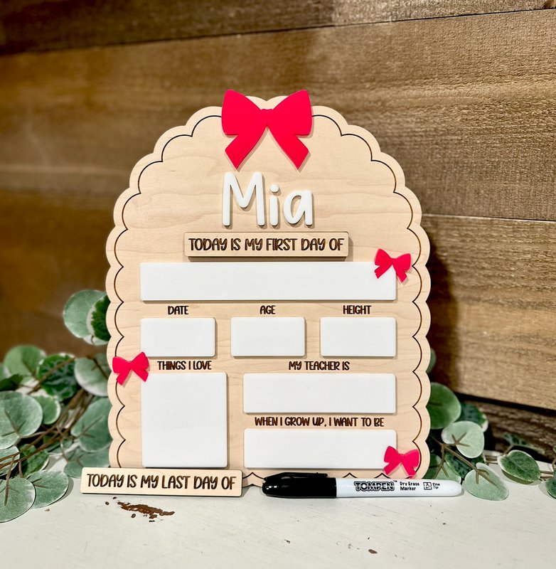 Celebrate your child’s big milestone with this adorable personalized first day of school sign! Featuring sweet bow accents and a scalloped wooden shape, this reusable board is perfect for capturing first- and last-day photos you’ll treasure for years.