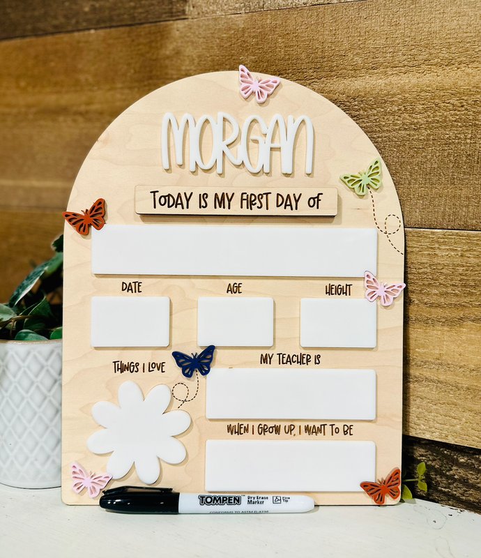 Capture the magic of the first day of school with this beautiful personalized wooden school sign! Featuring delicate butterfly accents and a soft neutral wood finish, this reusable board is perfect for milestone photos you’ll treasure year after year.