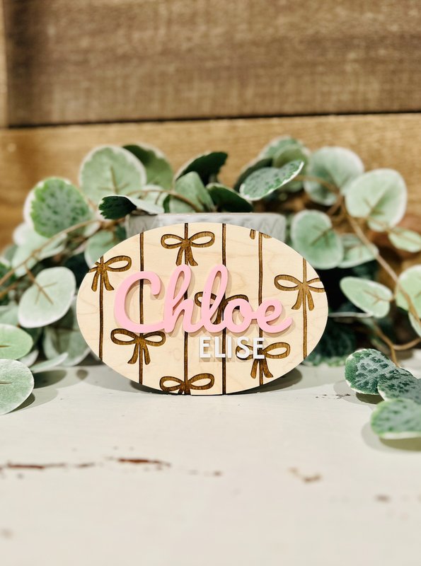Add a beautiful, personalized touch to your nursery with this custom wooden baby name sign. Featuring a soft bow pattern and raised name lettering, this piece is perfect for nursery shelves, dressers, or as a thoughtful keepsake gift.